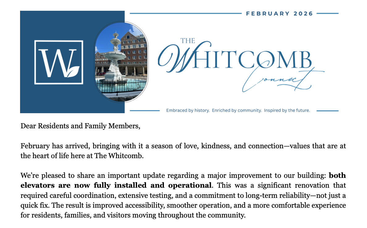 Stay plugged into everything happening at The Whitcomb. From lifestyle programming and wellness insights to resident spotlights, key updates, and upcoming events, this is your centralized hub for monthly news and community engagement. Each edition is designed to keep residents, families, and partners aligned, informed, and connected.